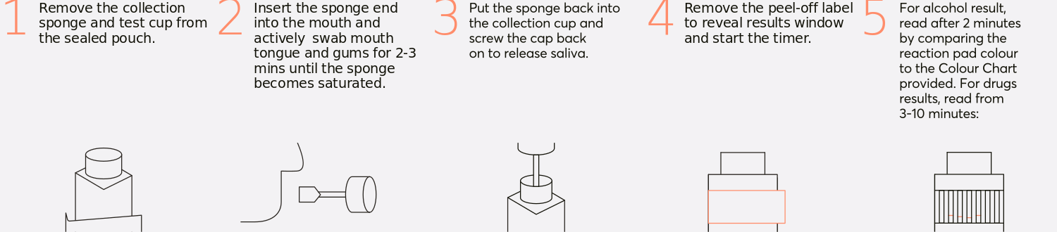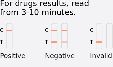 Self-test to detect common drugs in saliva, including amphetamine, cocaine, opiates, marijuana (THC), benzodiazepines, ketamine and alcohol.