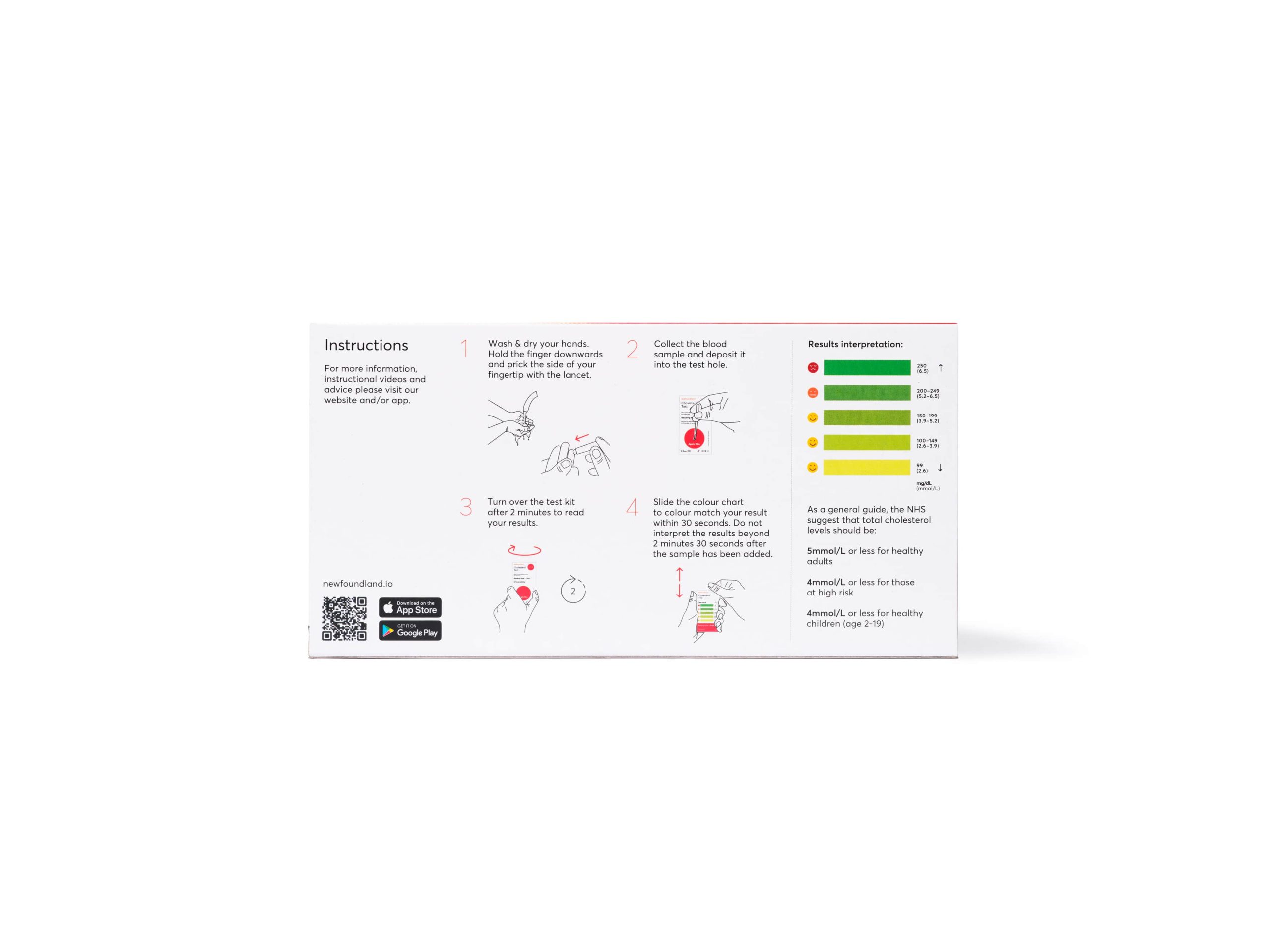 An at-home test to measure total cholesterol levels in your blood. High cholesterol increases your risk of coronary artery disease, heart attacks and strokes. The test also allows you to evaluate the effectiveness of current treatments or lifestyle changes.